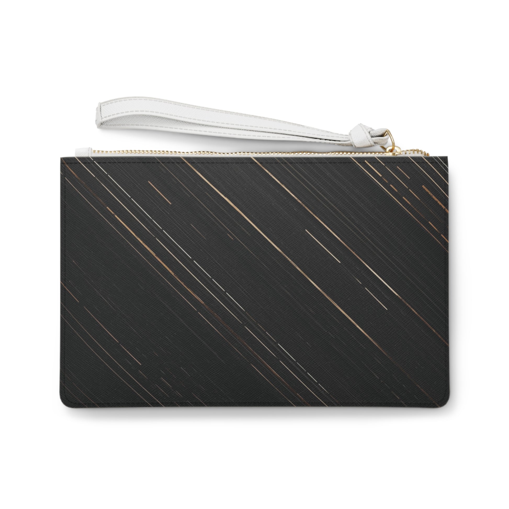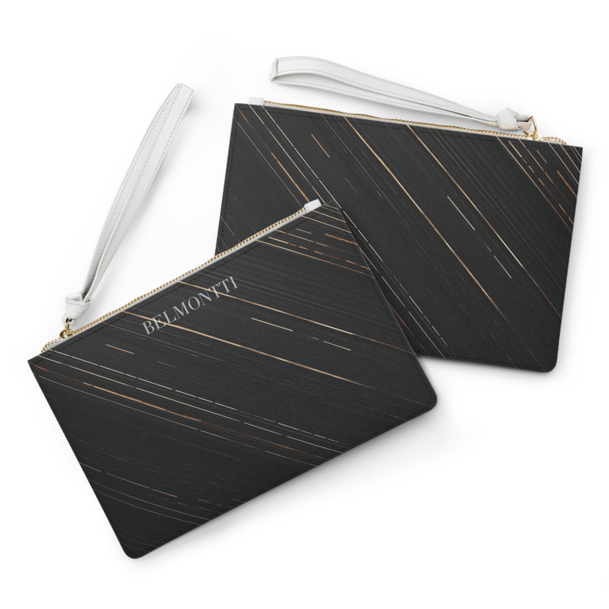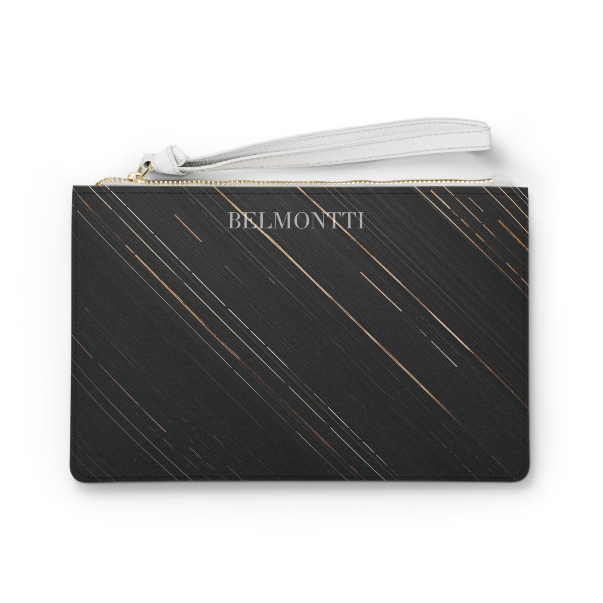 The Eclipse Clutch embodies sleek sophistication through contrast, deep black tones with fine streaks of gold light that echo motion, confidence, and quiet power. Its minimalist silhouette is elevated by a clean white wrist strap and the signature BELMONTTI mark, creating balance of strength and grace.